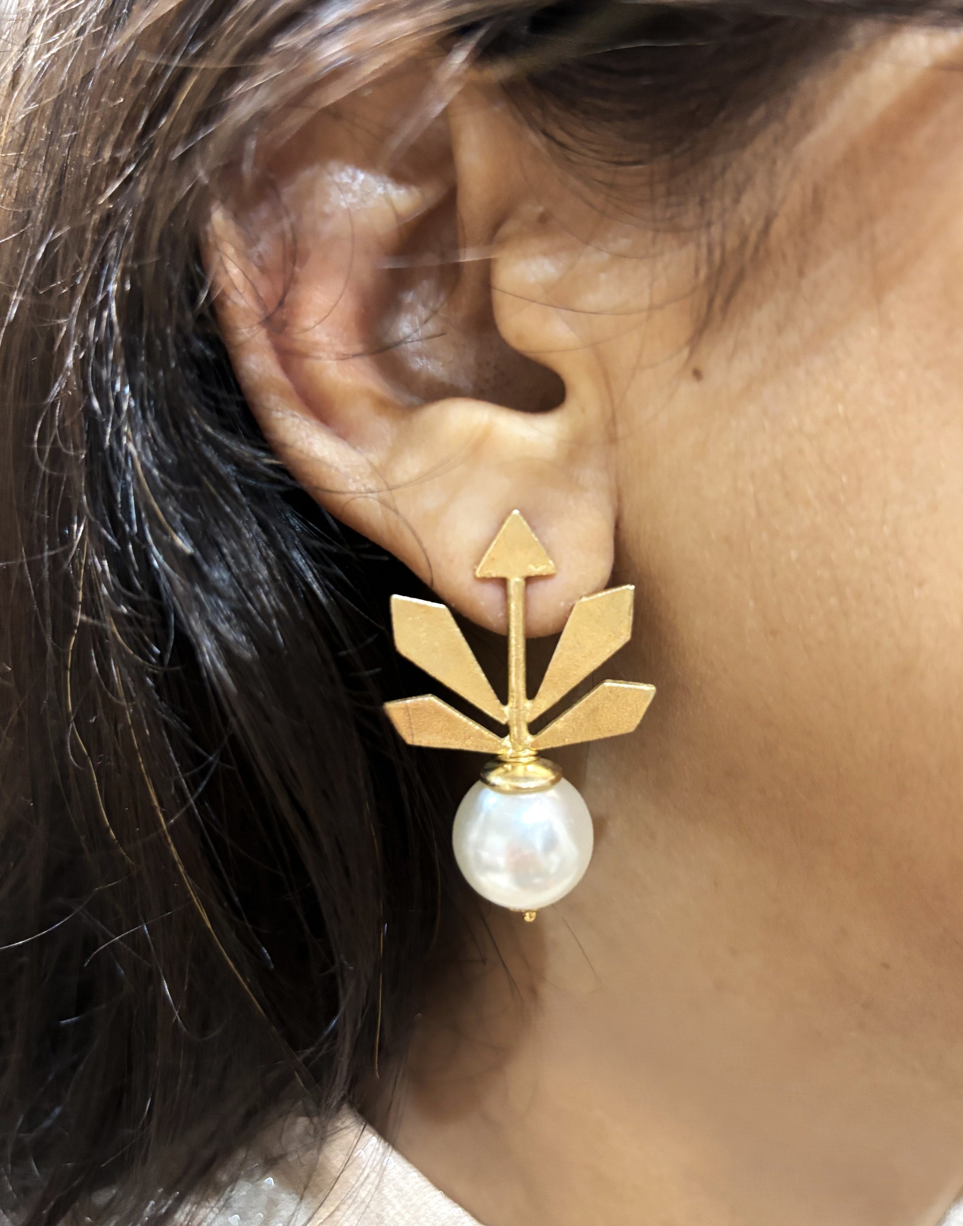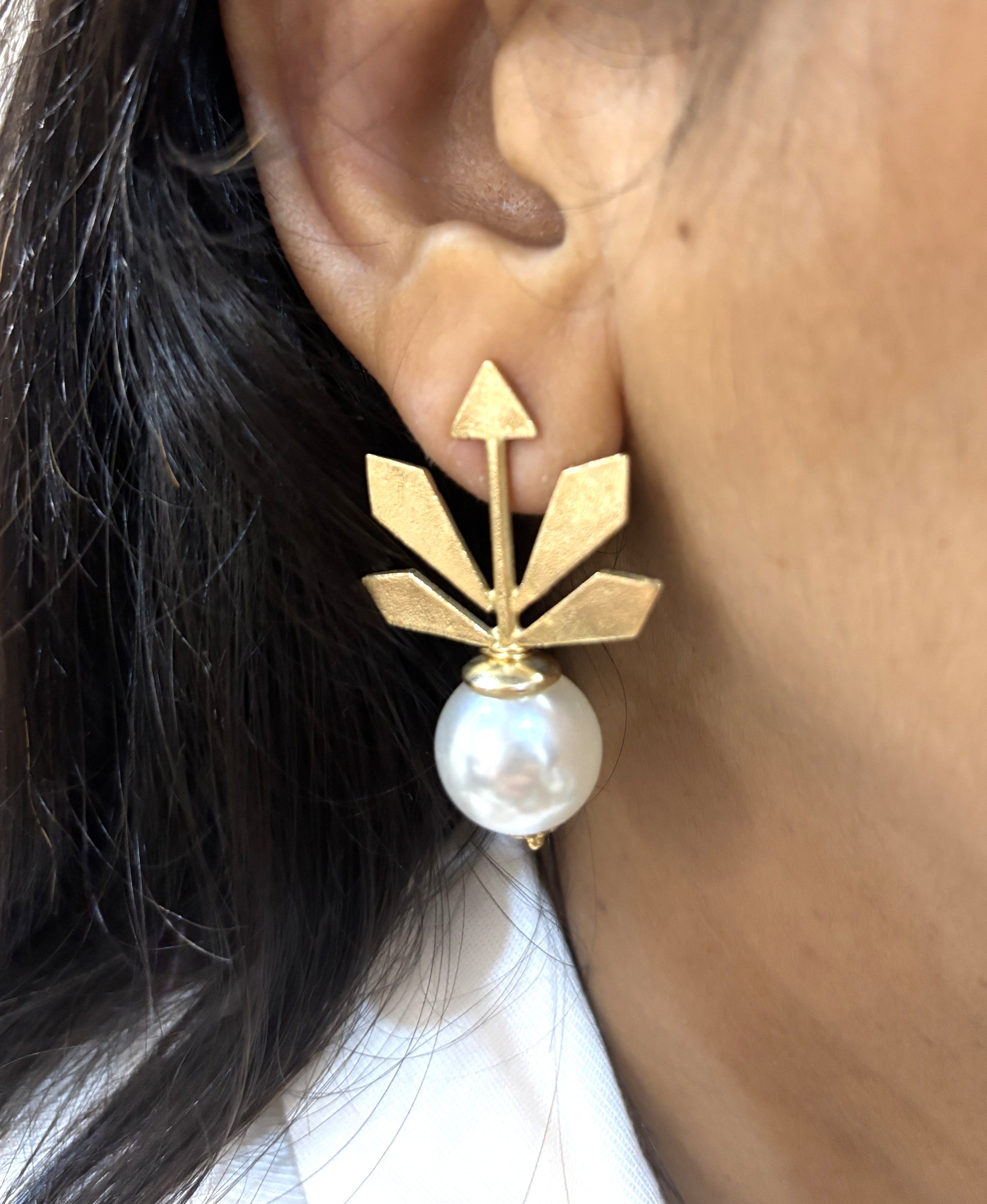 Step into your spotlight with these bold dull gold earrings, crowned by a statement pearl. Crafted from brass and medium in weight, they promise head-turning energy without compromising comfort. Keep dry and away from perfumes; gently wipe with a soft cloth. Store in an airtight box for everlasting shine.
