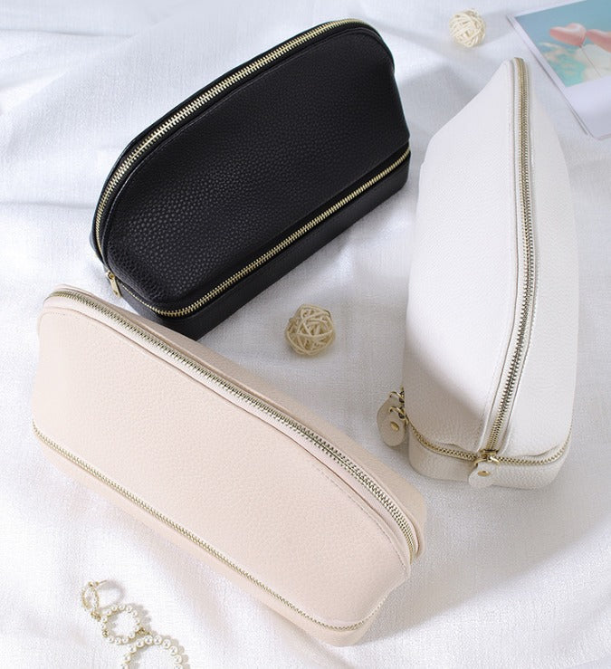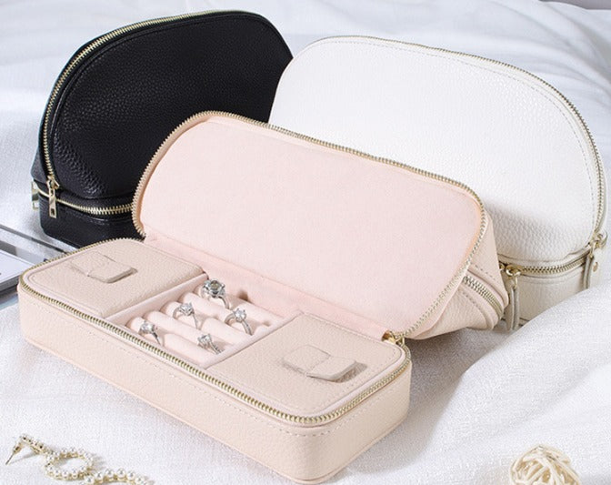 Made from premium textured material with a soft, plush interior, it’s gentle on your pieces and elegant to carry. Compact, sturdy, and timeless — the kind of case that looks as good on your dresser as it does in your bag. Thoughtfully designed to keep your rings and chains along with your cosmetics organized and safe, whether at home or on the go!