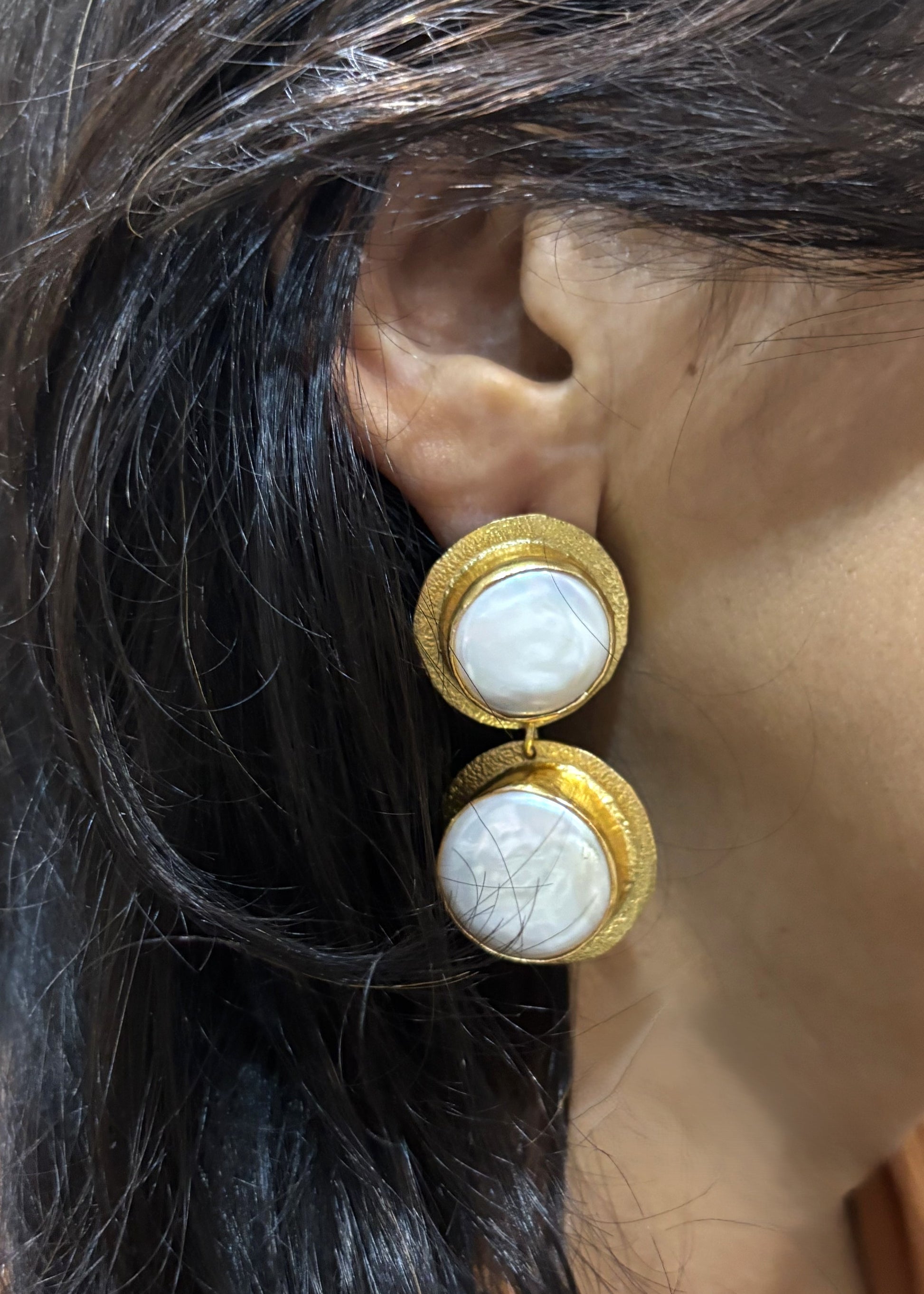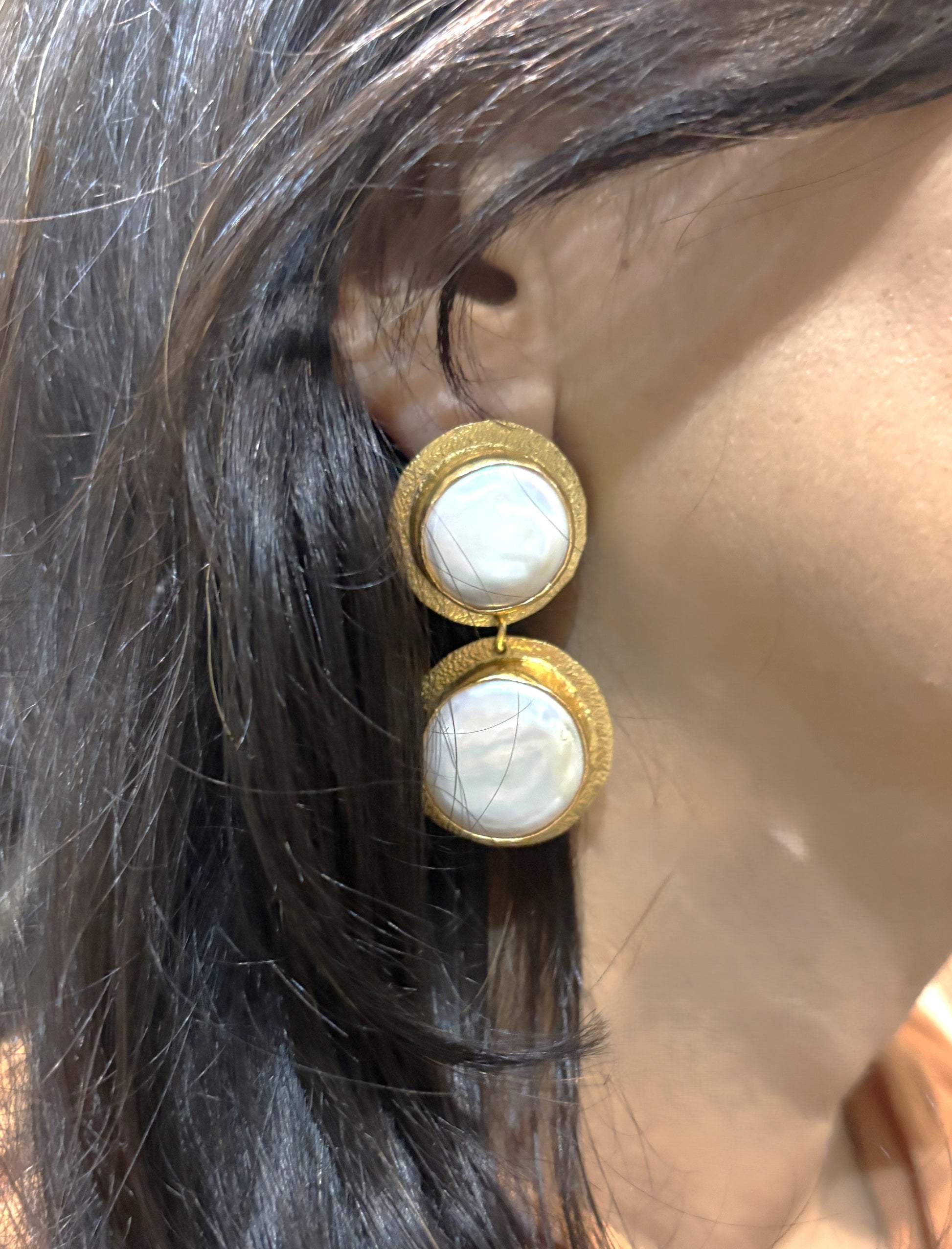 Double the drama, double the dazzle—these bold beauties flaunt two oversized faux pearls, all wrapped in textured gold-toned brass. Major main character vibes only: when you walk in, everyone else becomes an extra. Moderately heavy in weight, the statement made won't be light either. Keep dry and skip the perfume; wipe gently and store airtight to keep them turning heads.